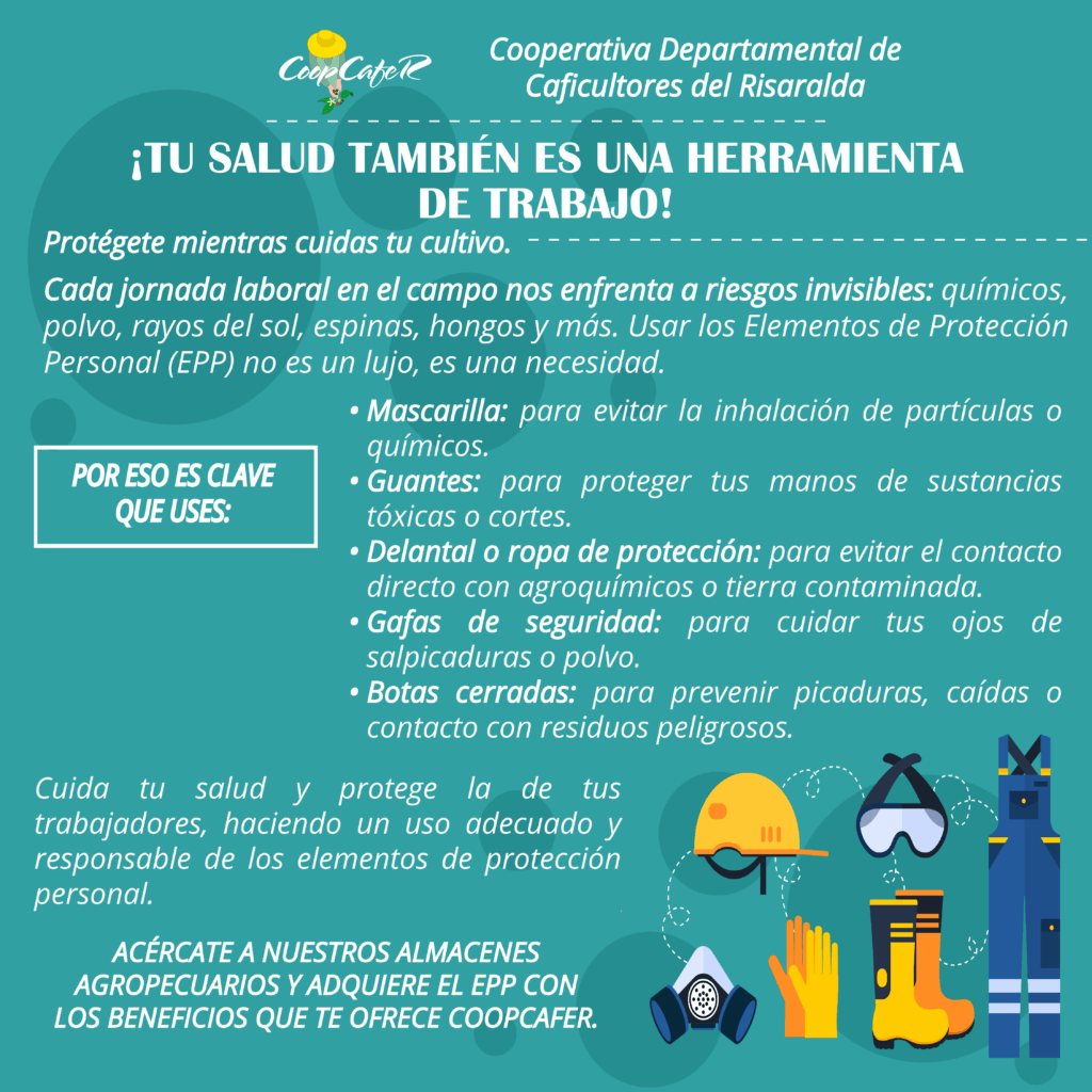 El manejo adecuado de los agroquímicos es fundamental para asegurar una producción de café de alta calidad. Sin embargo, es igual de crucial que tomes las medidas necesarias para proteger tu salud y la de quienes te rodean. El uso de elementos de protección personal (EPP) es una de las mejores maneras de minimizar los riesgos asociados con la exposición a pesticidas, fungicidas y otros productos químicos utilizados en el cultivo del café.
